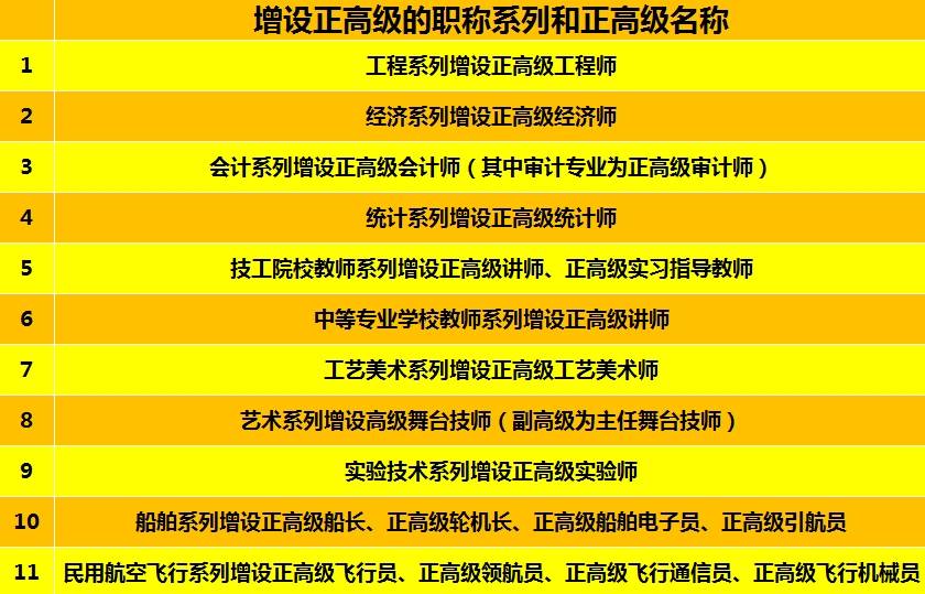 《通知》规定,在工程系列增设正高级工程师,经济系列增设正高级经济师,会计系列增设正高级会计师(其中审计专业为正高级审计师),统计系列增设正高级统计师,技工院校教师系列增设正高级讲师、正高级实习指导教师,中等专业学校教师系列增设正高级讲师,工艺美术系列增设正高级工艺美术师,艺术系列增设高级舞台技师(副高级为主任舞台技师),实验技术系列增设正高级实验师,船舶系列增设正高级船长、正高级轮机长、正高级船舶电子员、正高级引航员,民用航空飞行系列增设正高级飞行员、正高级领航员、正高级飞行通信员、正高级飞行机械员。农业系列继续开展农技推广研究员职称评审工作,可设置农业、林业相关专业。其他系列个别专业未设置到正高级职称的,在分类推进各系列职称制度改革时进一步完善。