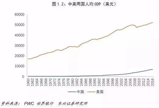 从GDP总量来看,根据世界银行公布的数据,按现价美元计算,2016年中国的GDP为11.20万亿,居世界第二,美国为18.57万亿,尚有7.37万亿的差距,我们预测中国的经济总量超过美国仍需十年以上的时间。