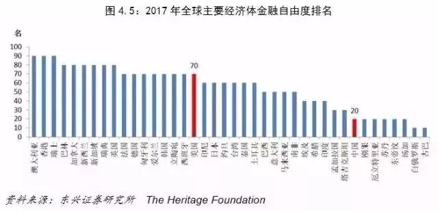根据美国传统基金会(The Heritage Foundation)2017年公布的金融自由度指数(Financial Freedom),欧洲、北非和美洲分别是全球范围内金融自由度最高的地区,其金融自由度指数分别为62.22、52.14和48.44,显著高于48.34的全球平均水平。横向对比来看,美国的金融自由度为70,全球排名20位;中国的金融自由度仅为20,全球排名160位。中国的金融自由度指数不仅远远低于美国等发达国家和地区,甚至还低于部分新兴市场国家,如巴西(50)、南非(50)和马来西亚(50)等,中国的金融业开放水平与中国当下的经济发展水平不相匹配,与美国相比更有诸多方面需要完善。