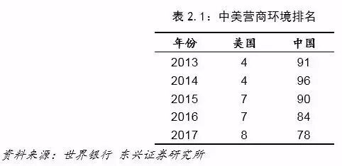 企业是经济活动中最重要的主体,是社会财富的主要创造者。营商环境在企业成长过程中扮演的角色举足轻重。总理曾指出,营商环境就是生产力。良好的经营环境对激发企业活力,促进经济持续增长起到十分重要的作用。从营商环境来看,根据世界银行近五年来发布的《全球营商环境报告》,中国的营商环境质量虽逐年改善,全球综合排名稳步上升,但与美国的相比仍有很大进步空间。近五年的数据显示,在约200个被调查国家中,中国已从96名(2014年)上升至78名,进步幅度明显,但美国一直稳居前十名。
