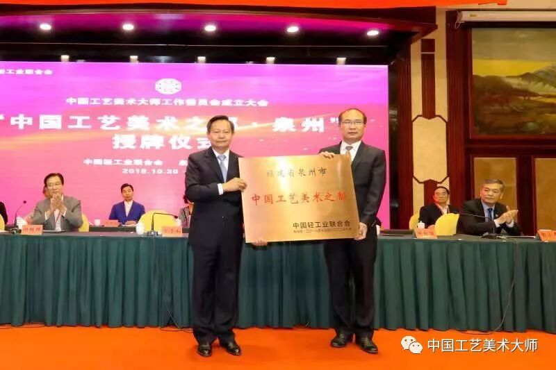 会议举行“中国工艺美术之都•泉州”授牌仪式,中国轻工业联合会会长张崇和向泉州市市长王永礼授牌。“中国工艺美术之都”称号将有助于泉州打造工艺美术品牌,提升工美作品知名度,推动工美产业转型升级。
