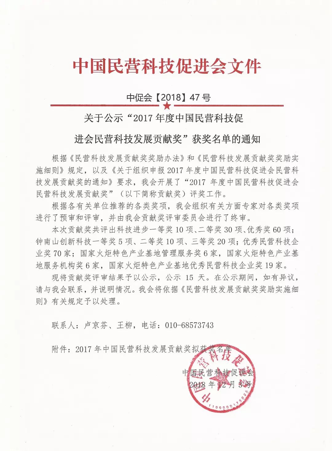 民营科技发展贡献奖是经科技部、国家科学技术奖励工作办公室批准设立,由中国民营科技促进会负责实施的社会奖项,旨在奖励在我国实施技术创新工作中成绩突出的民营企业。