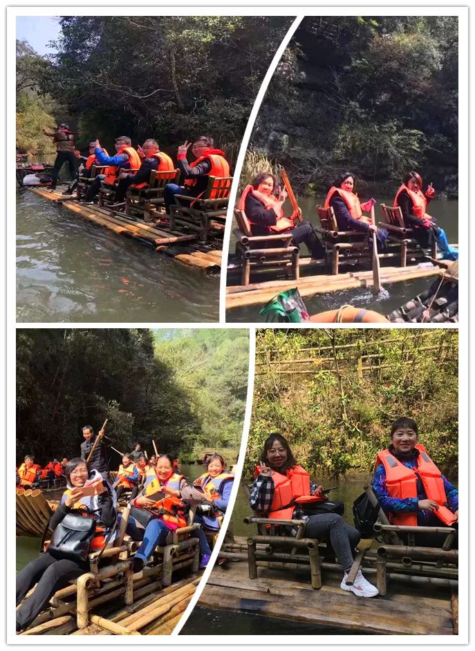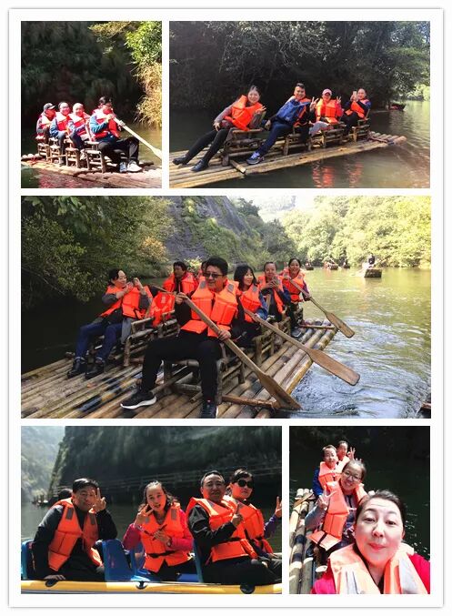 在九龙潭,全体伙伴泛舟潭中,伴着如画的风景,大家放声歌唱,铿锵有力的歌声回荡在峡谷间;每组竹筏上的伙伴们一同划桨,相互协作,好一番你追我赶的热闹场面。竹筏时而穿过山洞,时而穿过石桥,时而穿过隧道,每一个转弯,眼前又是另外一幅景象。