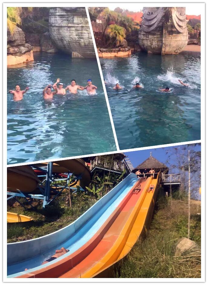 微冷的水抵挡不了伙伴们的热情,在游泳池里用各种泳姿你追我赶;在刺激的水上乐园,大家开心地玩水上滑梯,每一次的滑行都迎来阵阵笑声。