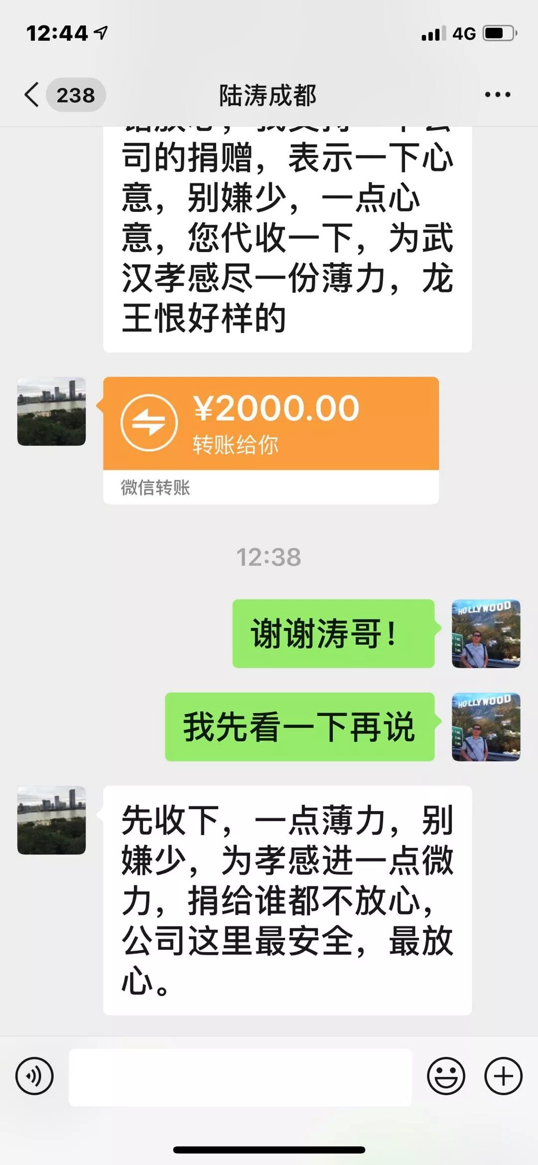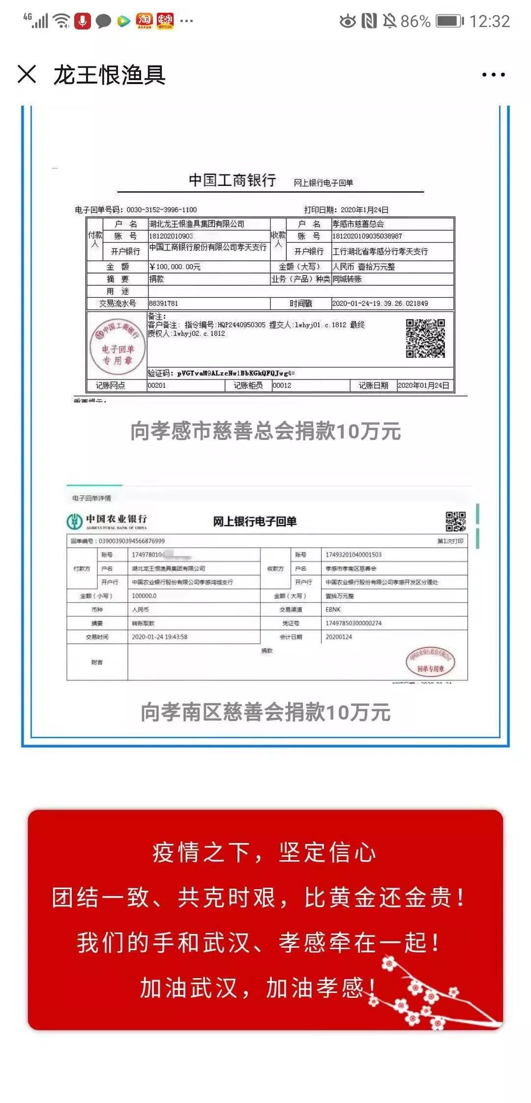 1 、疫情一直牵动着龙王恨人的心。在1月24日(除夕之夜),当获知官方专门捐赠平台开启后,董事长周文平第一时间指派集团总裁办迅速捐赠,当晚七点三十九分紧急向孝感市慈善总会和孝南区慈善会分别捐赠人民币10万元。