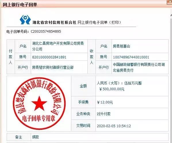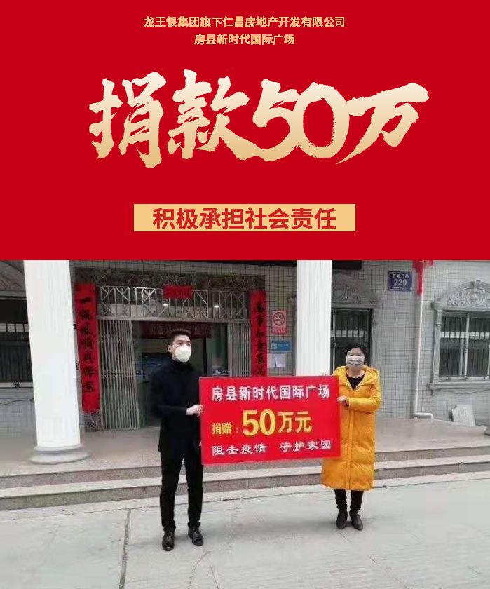 5 、肺炎疫情肆虐,爱心援助不止!为更大力度的抗疫,2月5日,龙王恨集团旗下仁昌房地产开发有限公司房县新时代国际广场向房县慈善会捐款50万元,用于疫情防控工作。